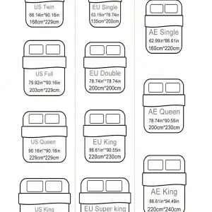 135cm 200cm, 203cm 229cm, 200cm 200cm, 168cm 229cm, 150cm 200cm, 200cm 230cm, 160cm 220cm, 229cm 229cm, 260cm 220cm, 264cm 229cm